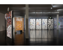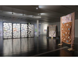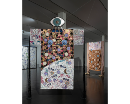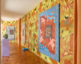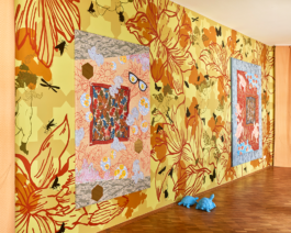 Équilove, 2017, gouache on Ikat fabric, 204 × 140 cm and Sol de seins, stickers floor installation