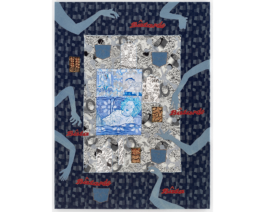 wood frame, jeans, vegetable-dyed Kalamkari cotton fabric, stickers, blue painted stones, gouache and silkscreen on paper