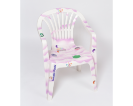 Fantastic Plastic, Monobloc chairs, Lila, 2022, spray paint and stickers on plastic, 54 x 80 x 56 cm