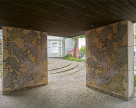 Installation consisting of printed transparent textile panels each appr. 200 cm x 140 cm