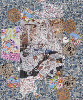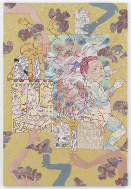 Soft Situation and Curls, 2018, silkscreen, inkjet print and ink on canvas and sewn textile, 200 × 150 cm