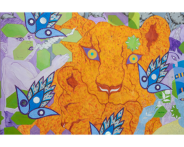 Mixed media: acrylic paint, watercolor, acrylic mirrors, chains, glazed ceramic, textile, and painted hard foam panels