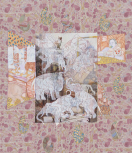Jeté d’éléphant, 2019, silkscreen, gouache and acrylic on canvas and sewn textile, 200 × 130cm